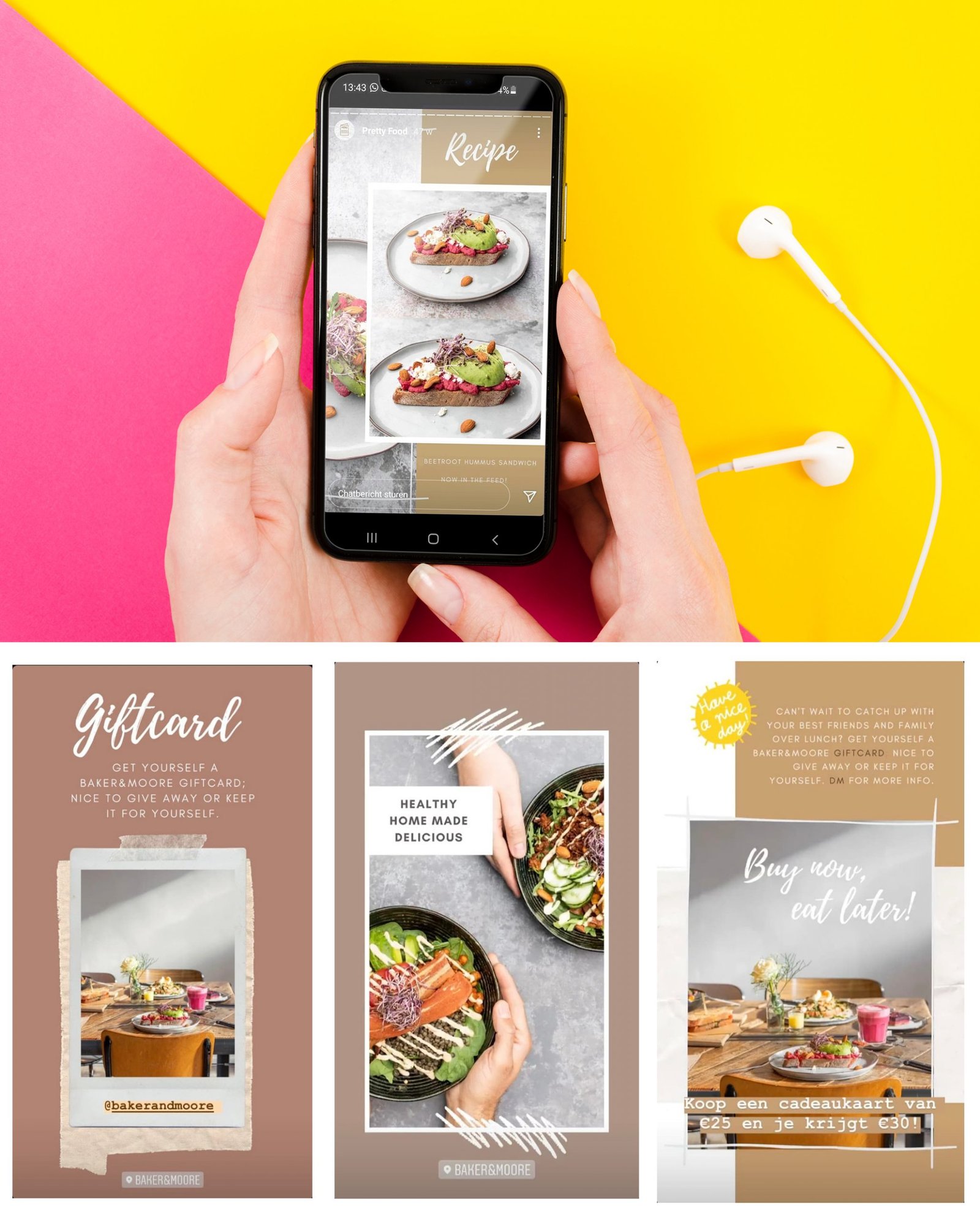 Content nodig voor social media? Voor Instagram stories, Facebook banners, advertentie posts of andere content kan ik designs voor jou ontwerpen, maar ook mee helpen met de content!